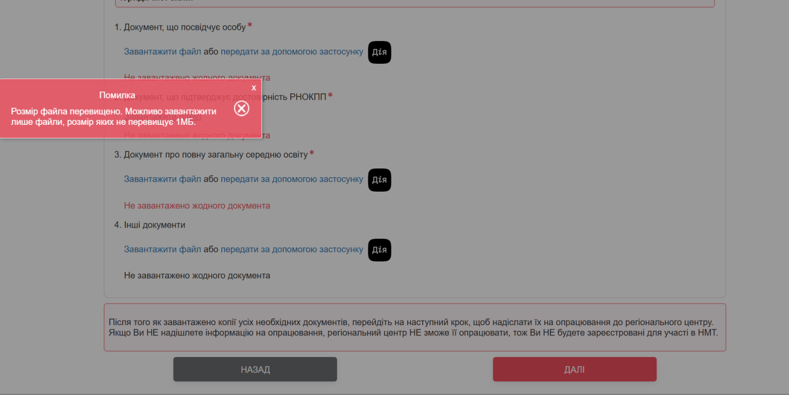 Увага! Не можна завантажувати скриншота електронної копії документа з мобільному застосунку «Дія» замість сканкопії (фотокопії) документа, що посвідчує особу, або документа, що підтверджує здобуття повної загальної середньої освіти, адже такий скриншот НЕ має юридичної сили.