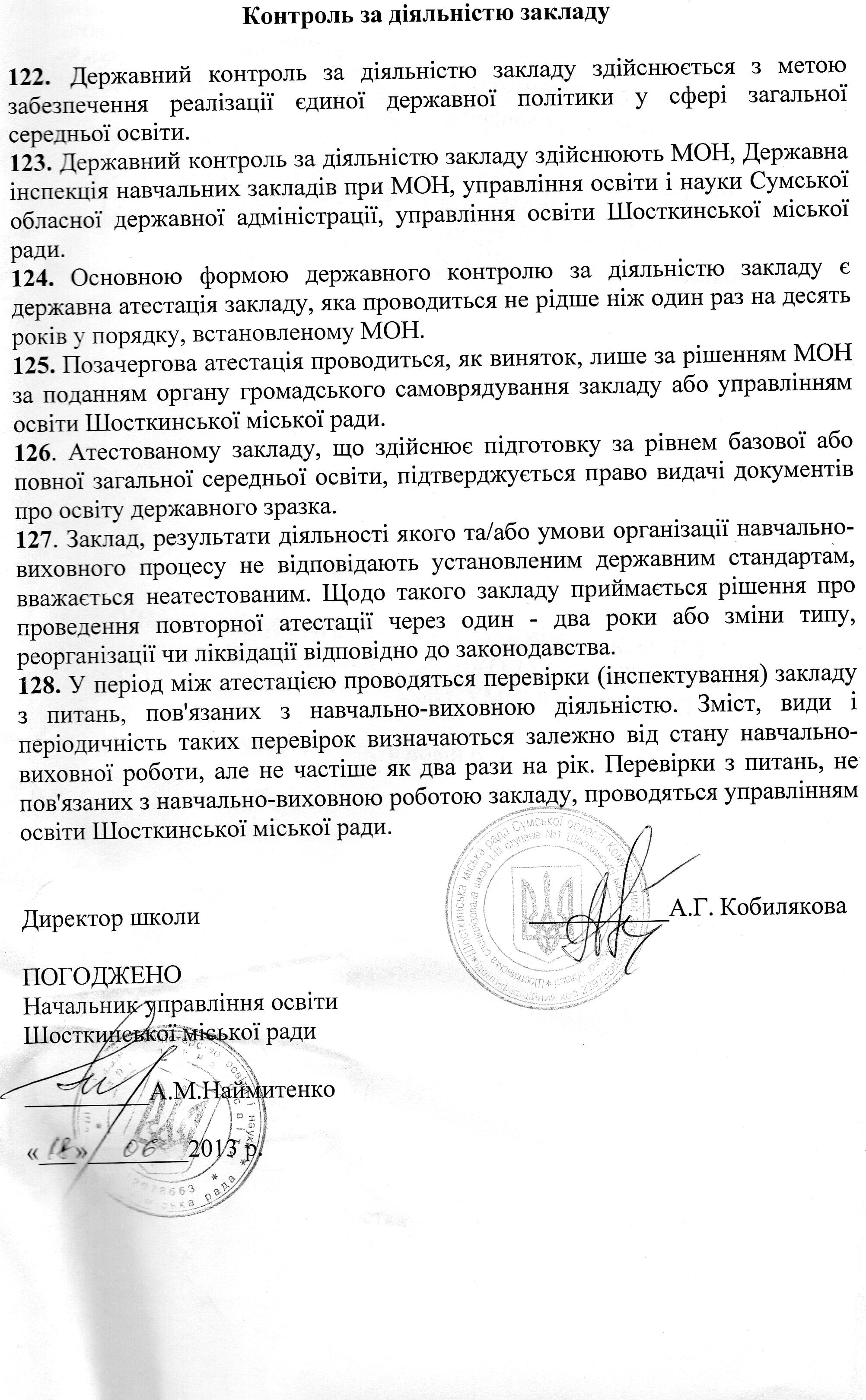 - Державний контроль за діяльністю закладу здійснюють МОН, Державна інспекція навчальних закладів при МОН, управління освіти і науки Сумської обласної державної адміністрації, управління освіти Шосткинської міської ради.